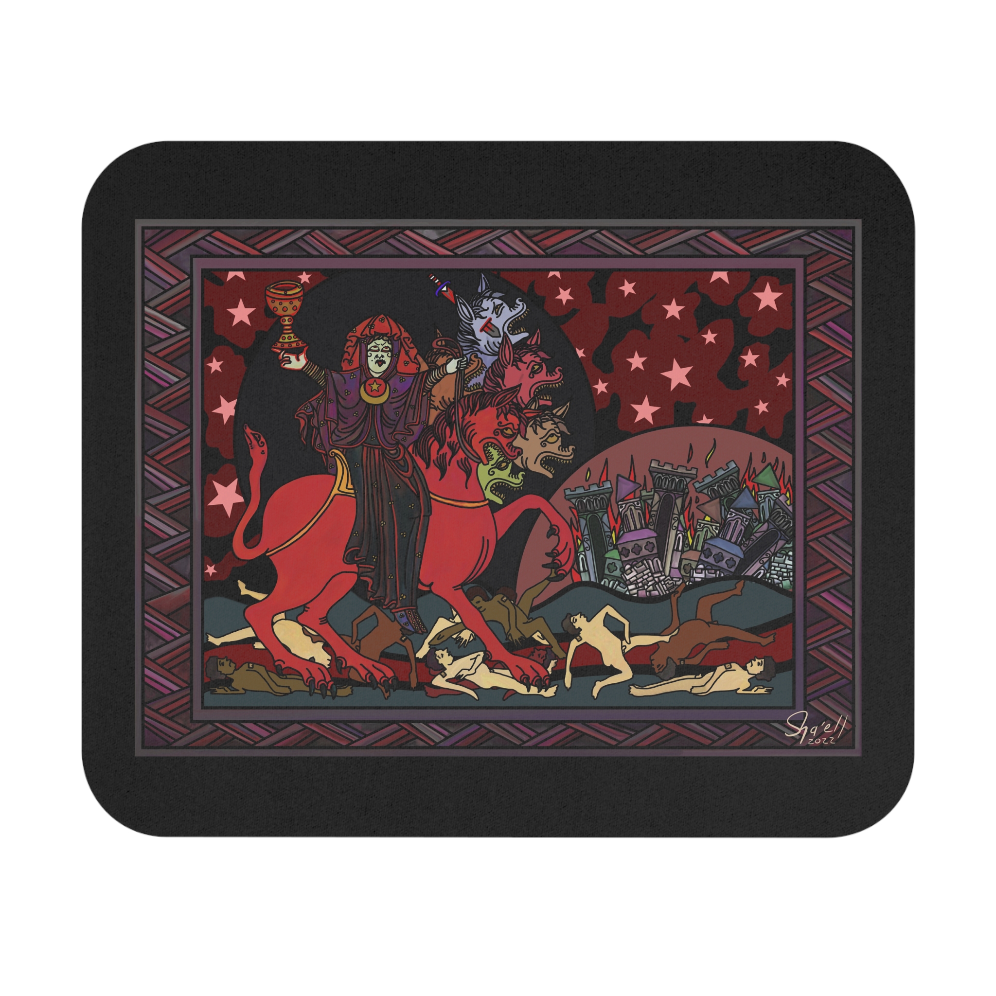 Blood of the Saints is inspired specifically by details from the Saint-Sever Beatus (11th century). It features the “Great Harlot” or “Mystery Babylon” riding the Great Beast, “drunk on the blood of the saints”. Note the wonded head of the Beast, the trampled victims and the burning city.