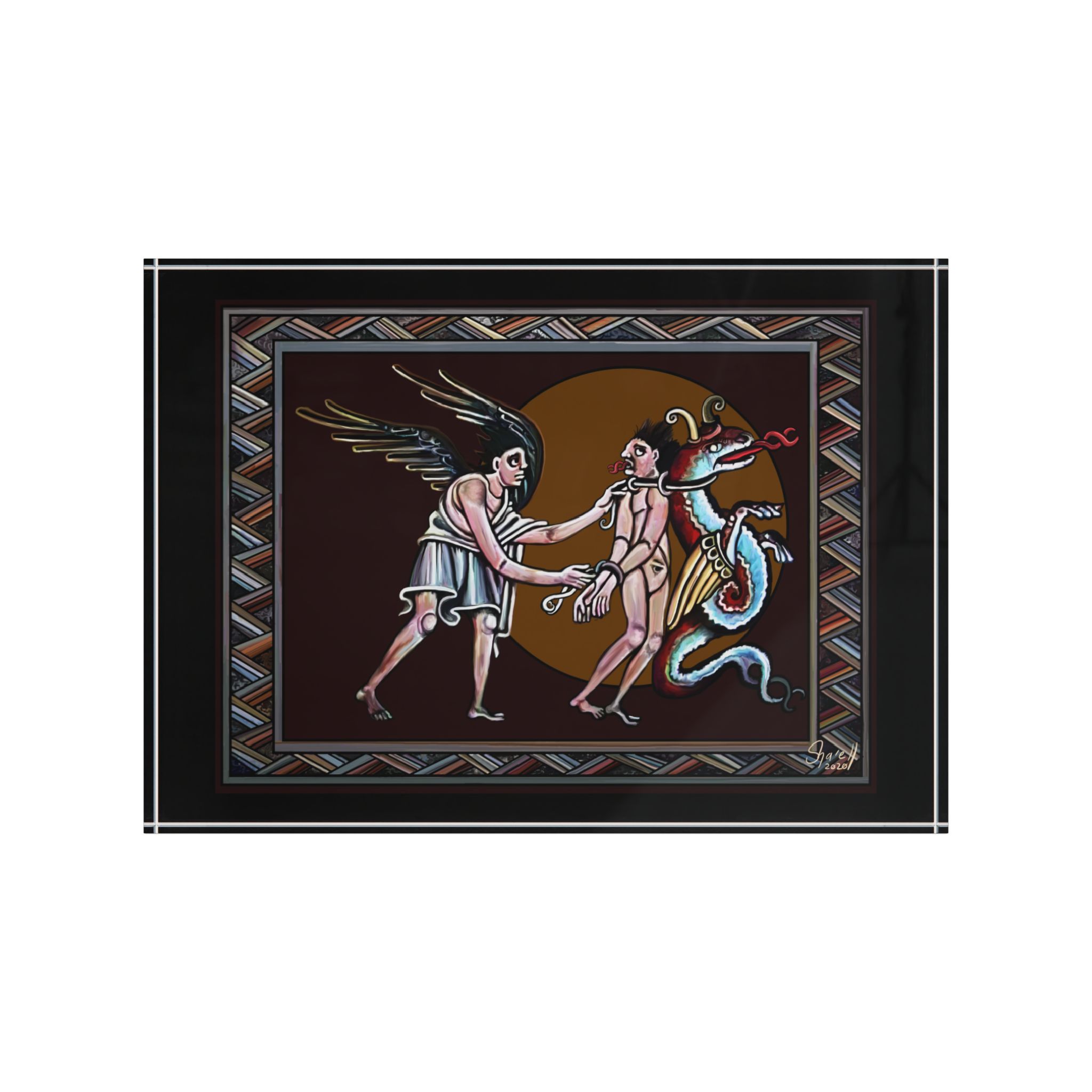 Deceiver of the Marked is inspired specifically by details from the Bamberg Apocolypse (11th century). It features an angel leading the False Prophet, bound together with Satan to their final judgement. Note the DNA-spiral forked tounges as the human conforms to the beast at a fundamental level.