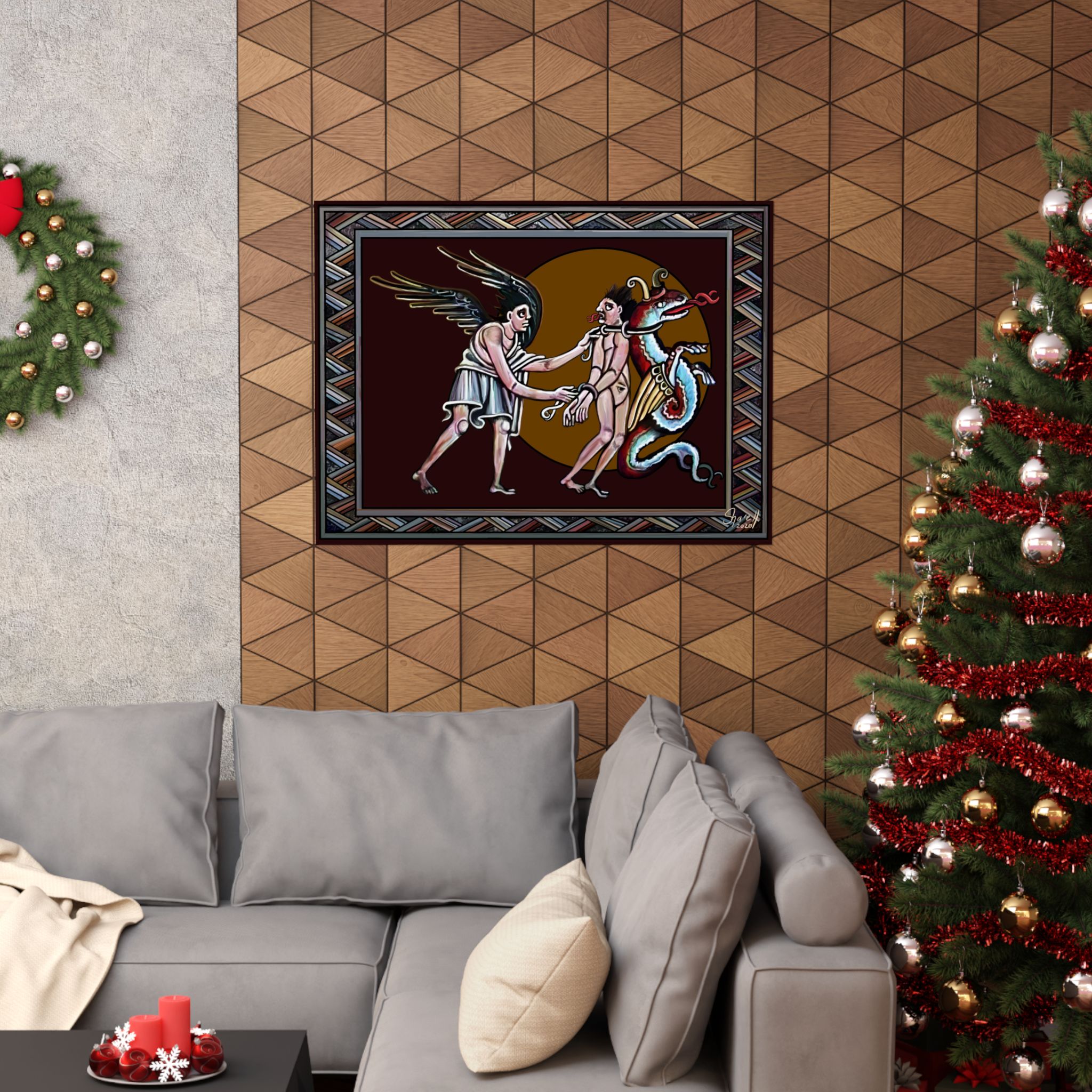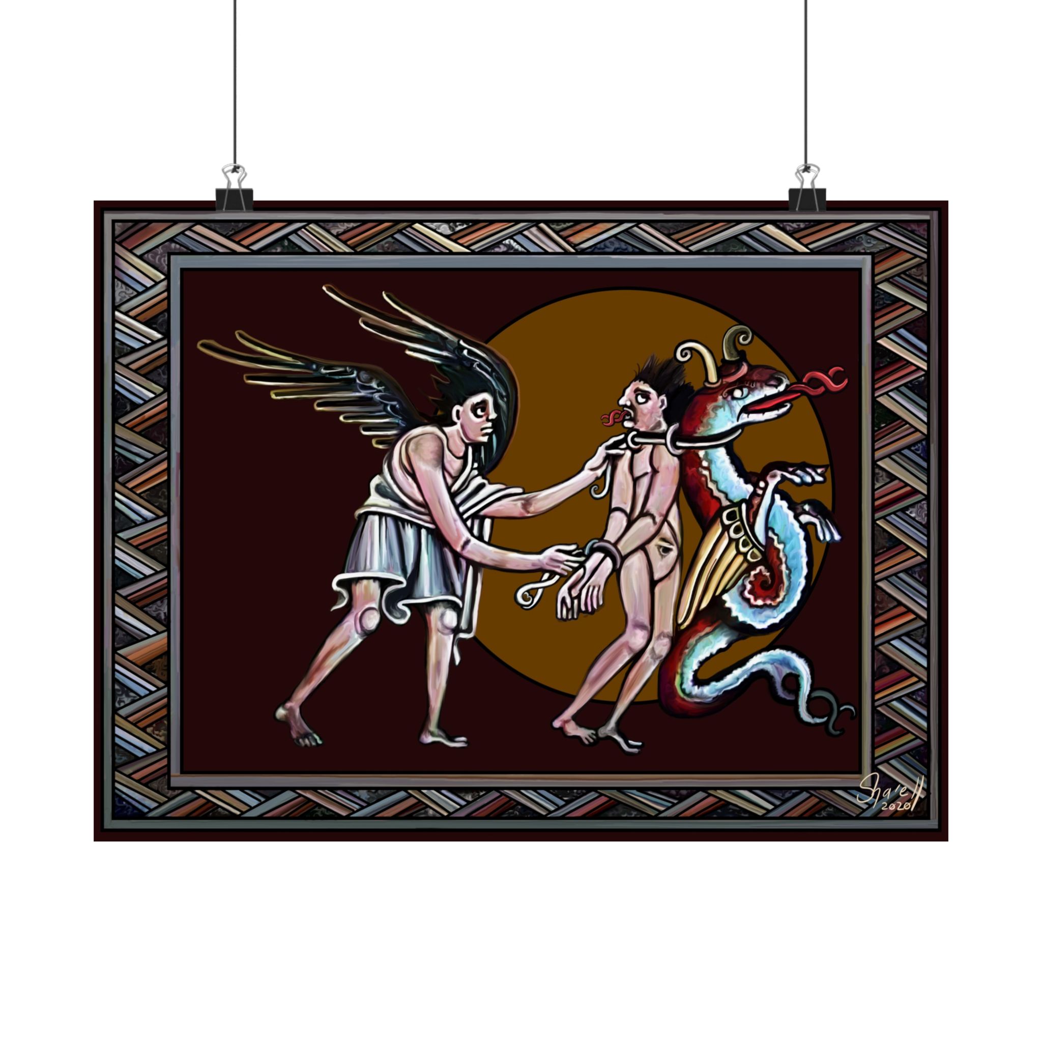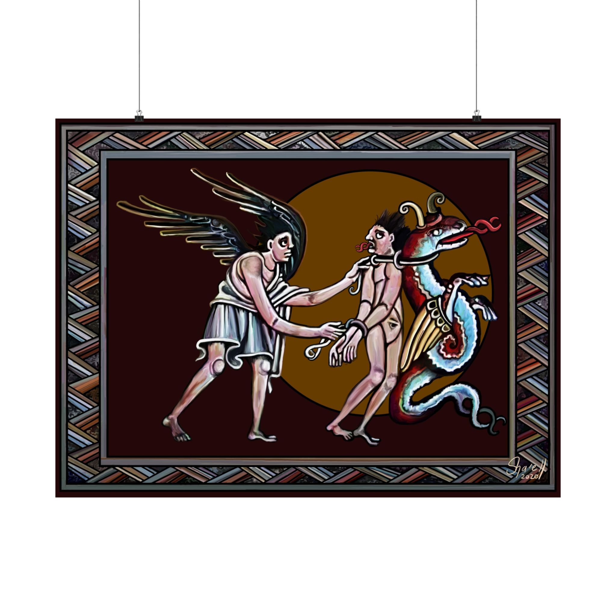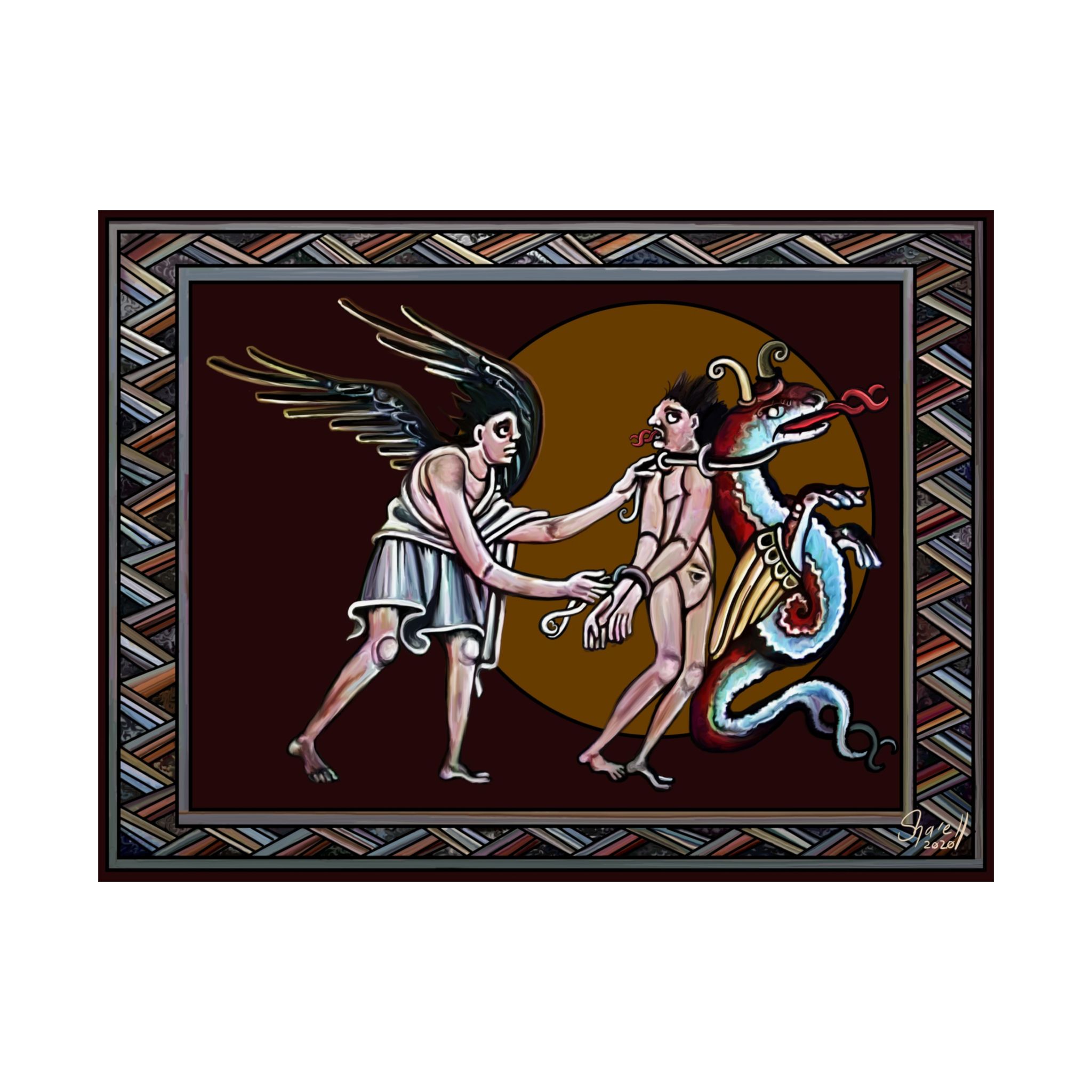 Deceiver of the Marked is inspired specifically by details from the Bamberg Apocolypse (11th century). It features an angel leading the False Prophet, bound together with Satan to their final judgement. Note the DNA-spiral forked tounges as the human conforms to the beast at a fundamental level.