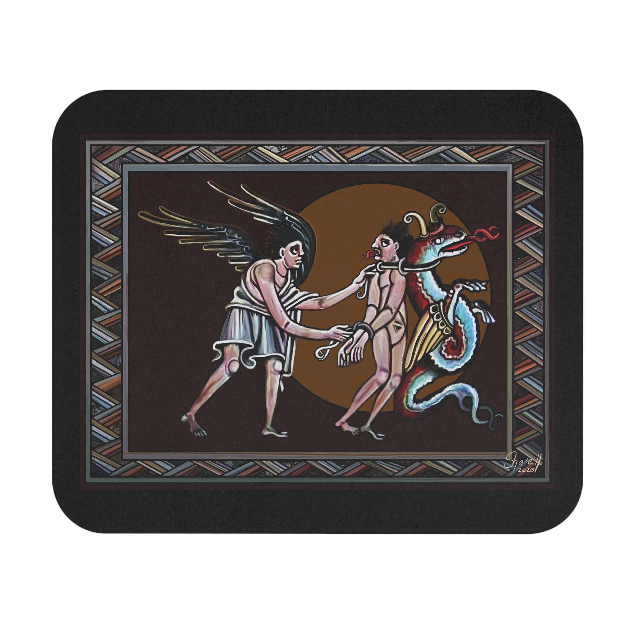 Deceiver of the Marked is inspired specifically by details from the Bamberg Apocolypse (11th century). It features an angel leading the False Prophet, bound together with Satan to their final judgement. Note the DNA-spiral forked tounges as the human conforms to the beast at a fundamental level.